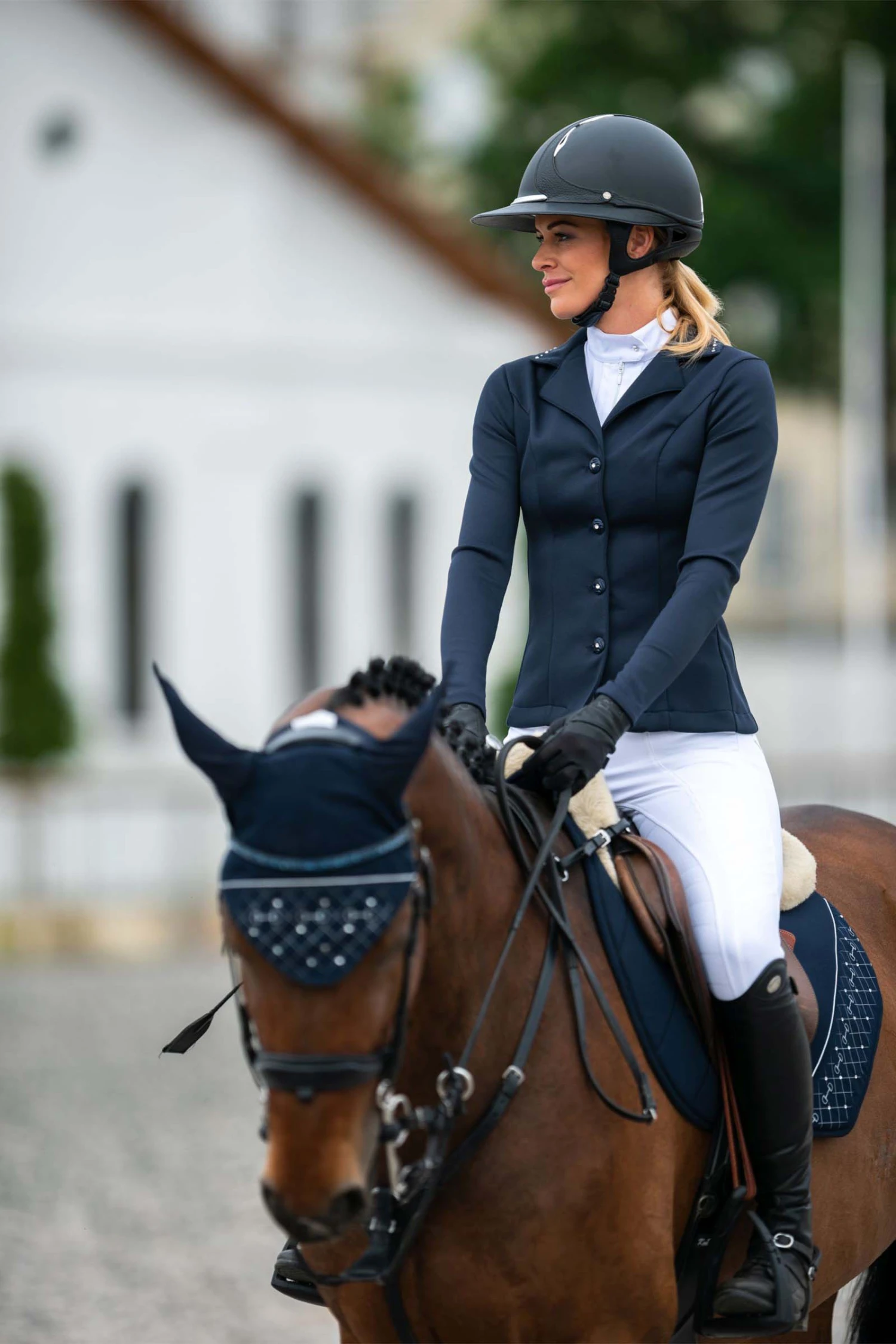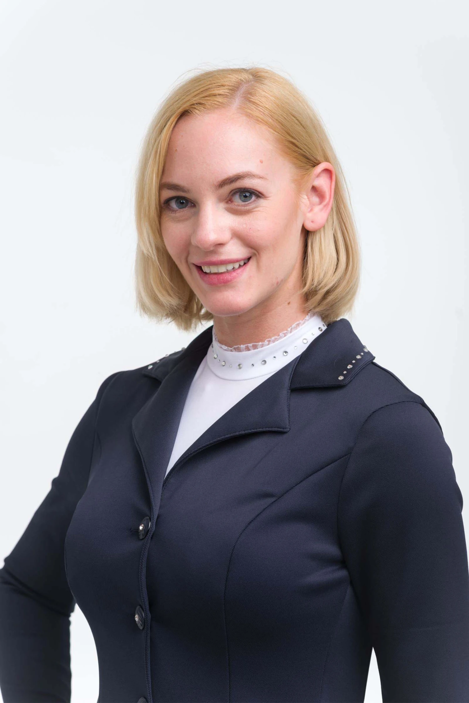 Tailored for success, this show jacket made with ‘Second Skin’ Technology empowers you with confidence. Expertly tailored, superior stretch that made of technical softshell pique fabric. Designed for maximum freedom of movement and performance in the ring. This lightwear riding jacket without lining is cut to create a supremely accommodating fit that flatters any type of body providing an elegant and slim silhouette that allows this show coat to move with the body thanks to its figure flattering cut and elasticity. Decorated with crystals on the collar. Matching show shirts are available.