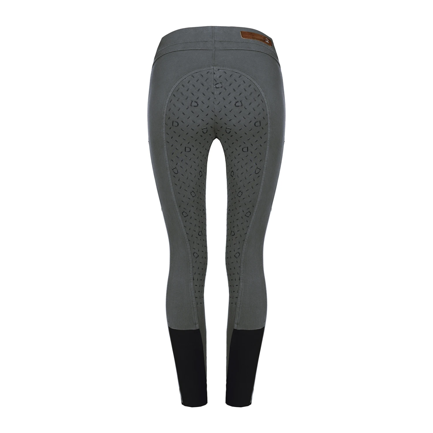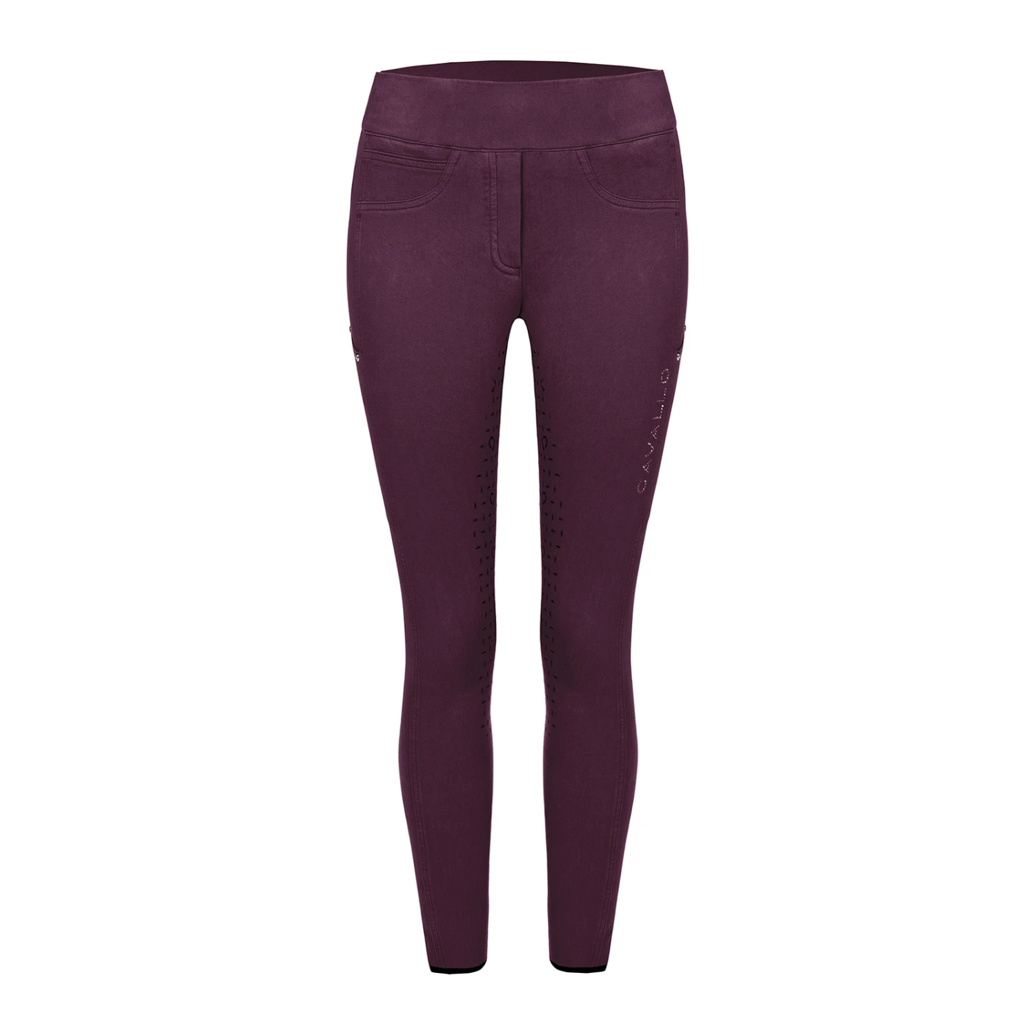 Riding leggings made of casually pre-washed dyed cotton. The material has mainly been sustainably produced from recycled polyester and cotton. A perfect fit is guaranteed by the wide waistband. Annoying seams at the knee could be avoidec thanks to a special cut. The resulting seam pattern integrates 2 phone pockets at the sides. A Cavallo logo made of precious sparkling crystals can be found on the back belt loops.