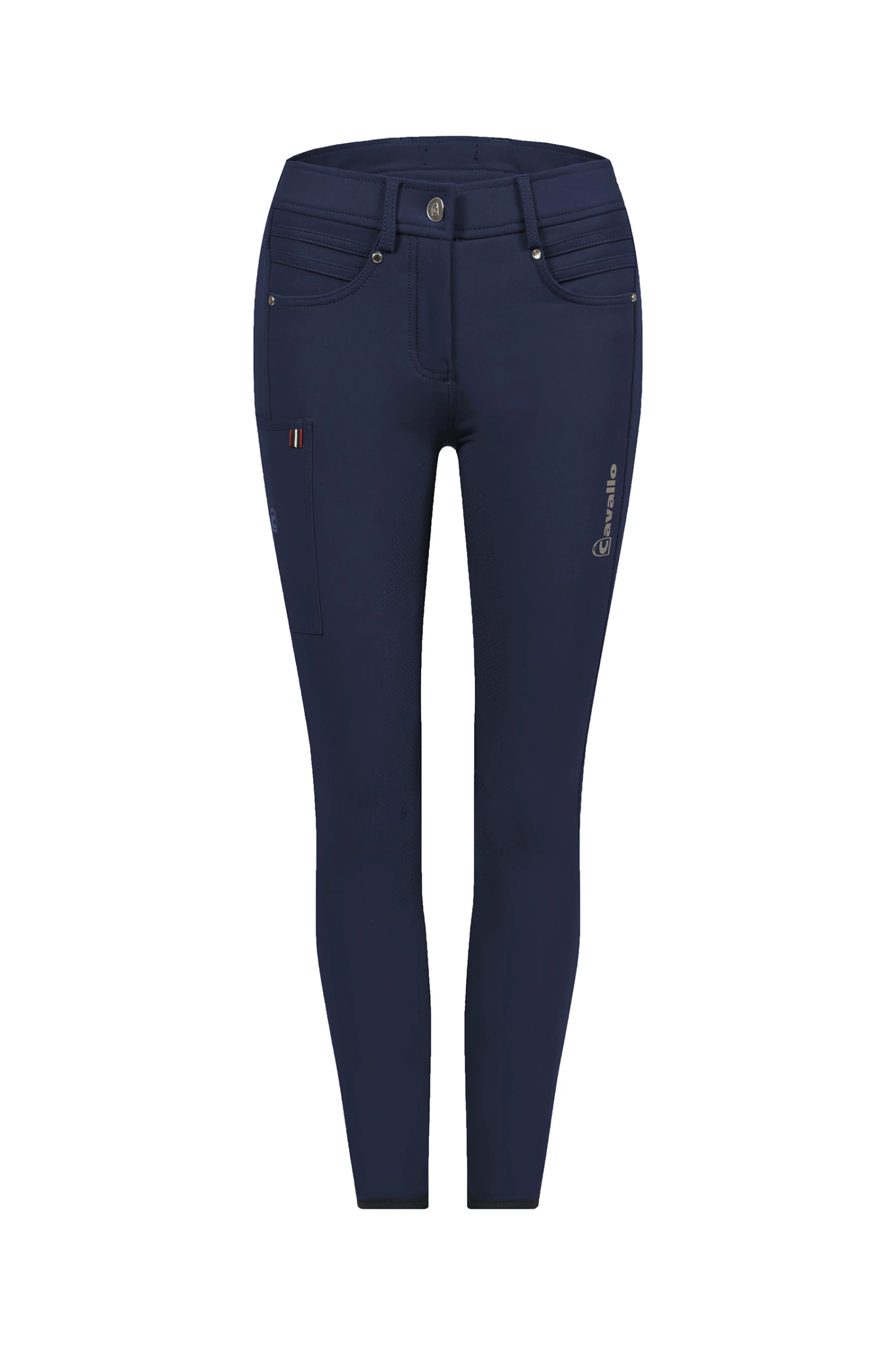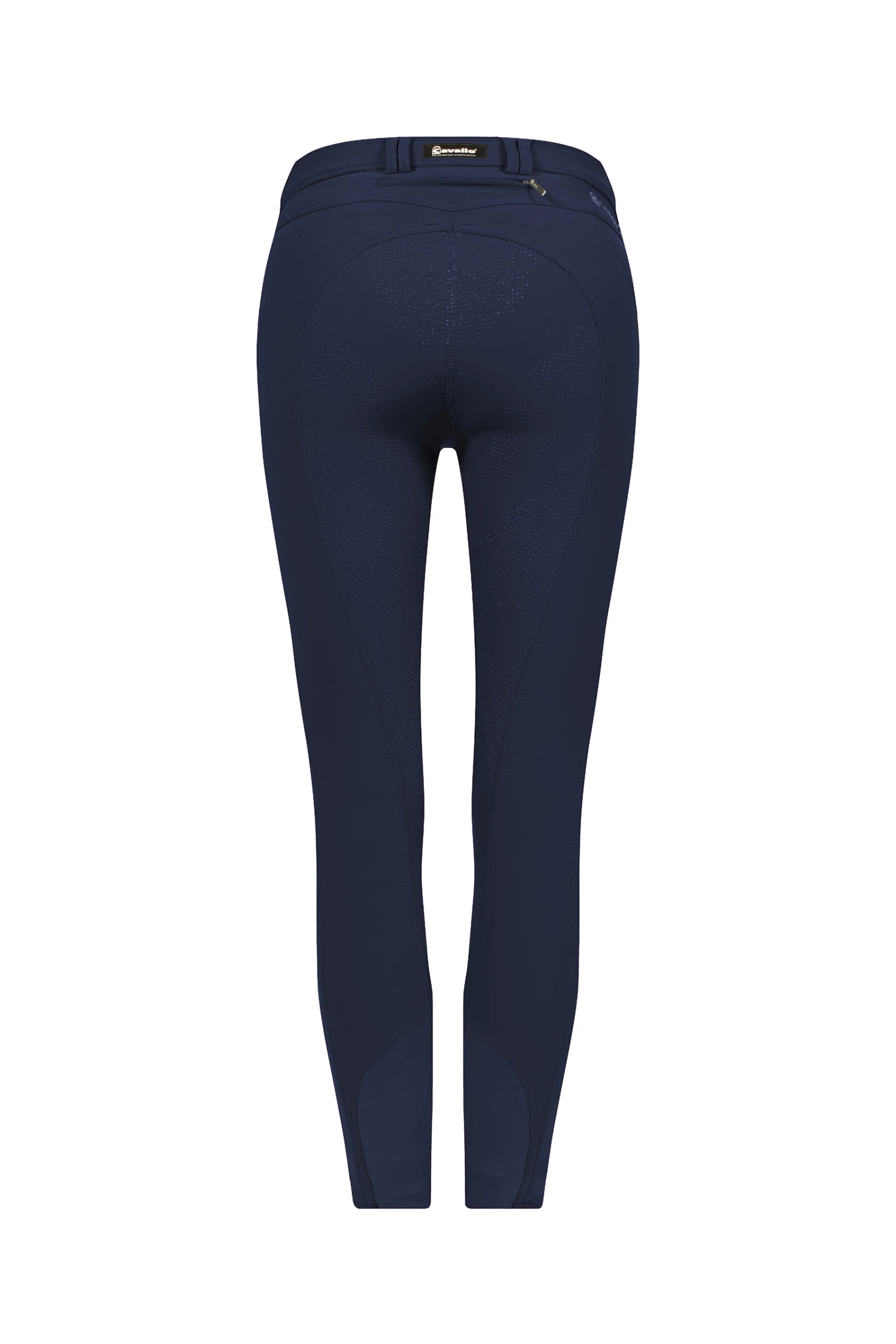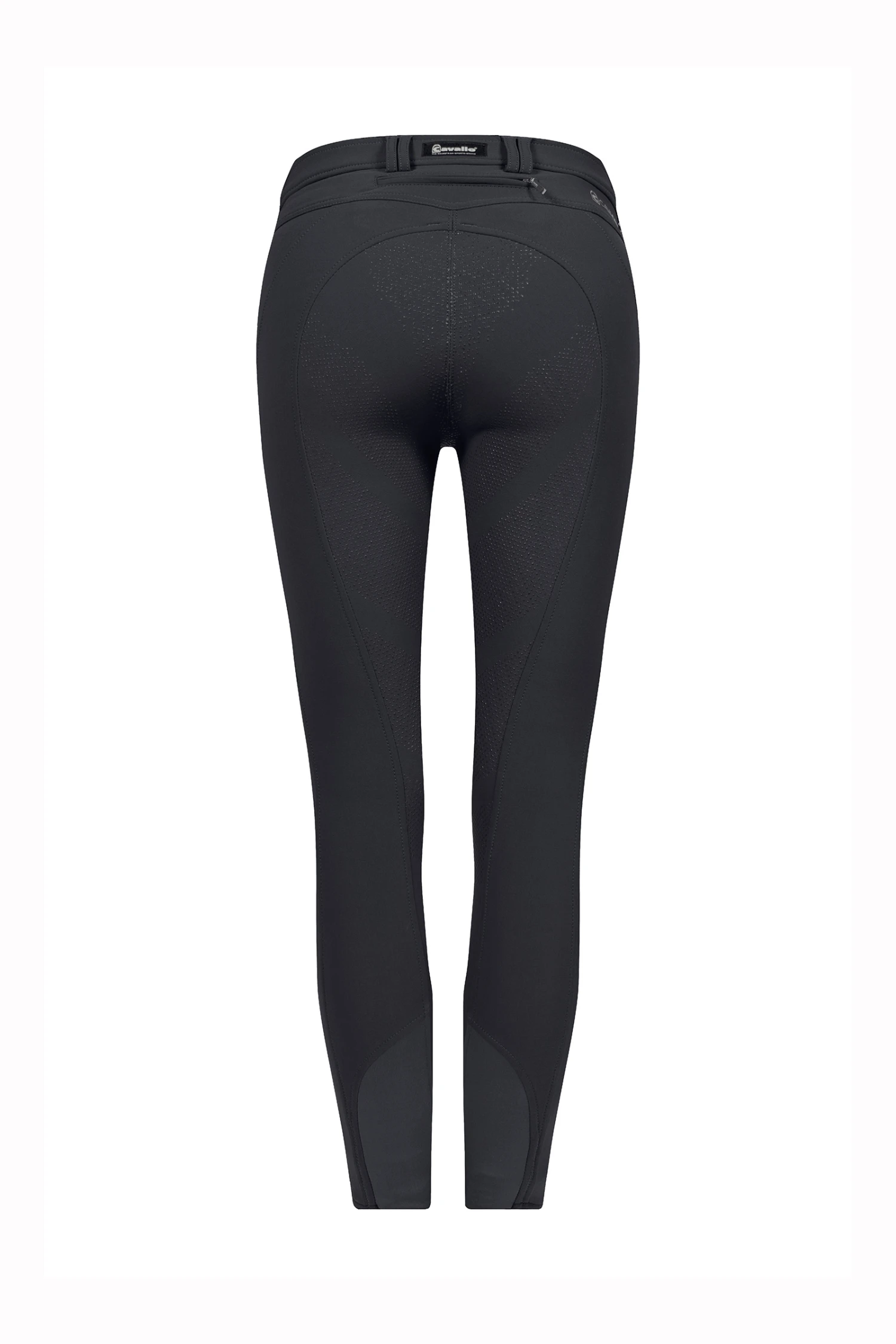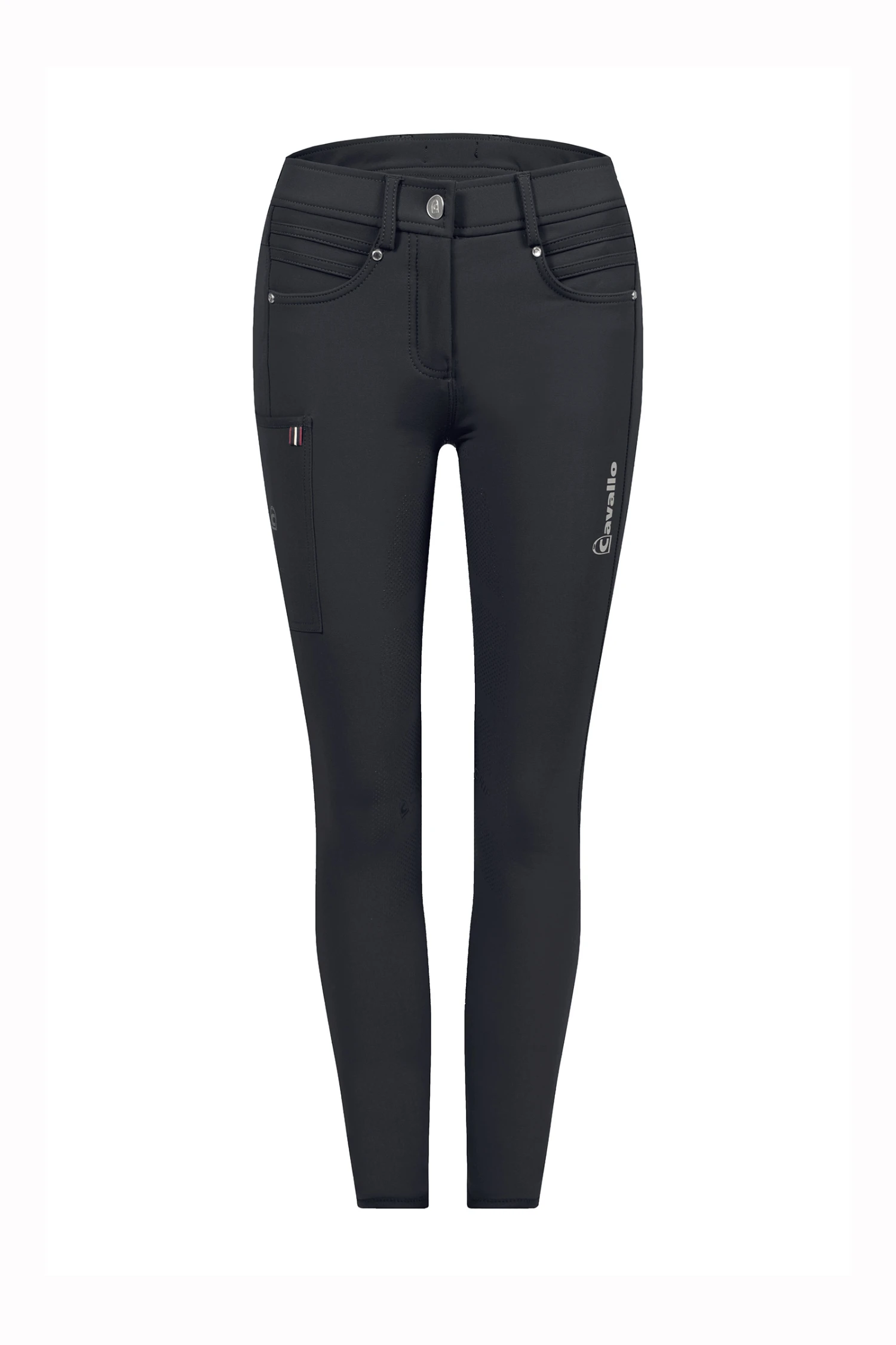 Sporty breeches in 5-pocket-look. Two comfortable pockets in front, decorated with sparkling crystal rivets. Full comfort due to missing dividing seam at knee. Attached mobile phone pocket, with Cavallo typical stripy elastic tape and stirrup print. Additional zip pocket on back yoke provides safe space for important things. Subtle seam layout on back pants creates the perfect, sporty shape.