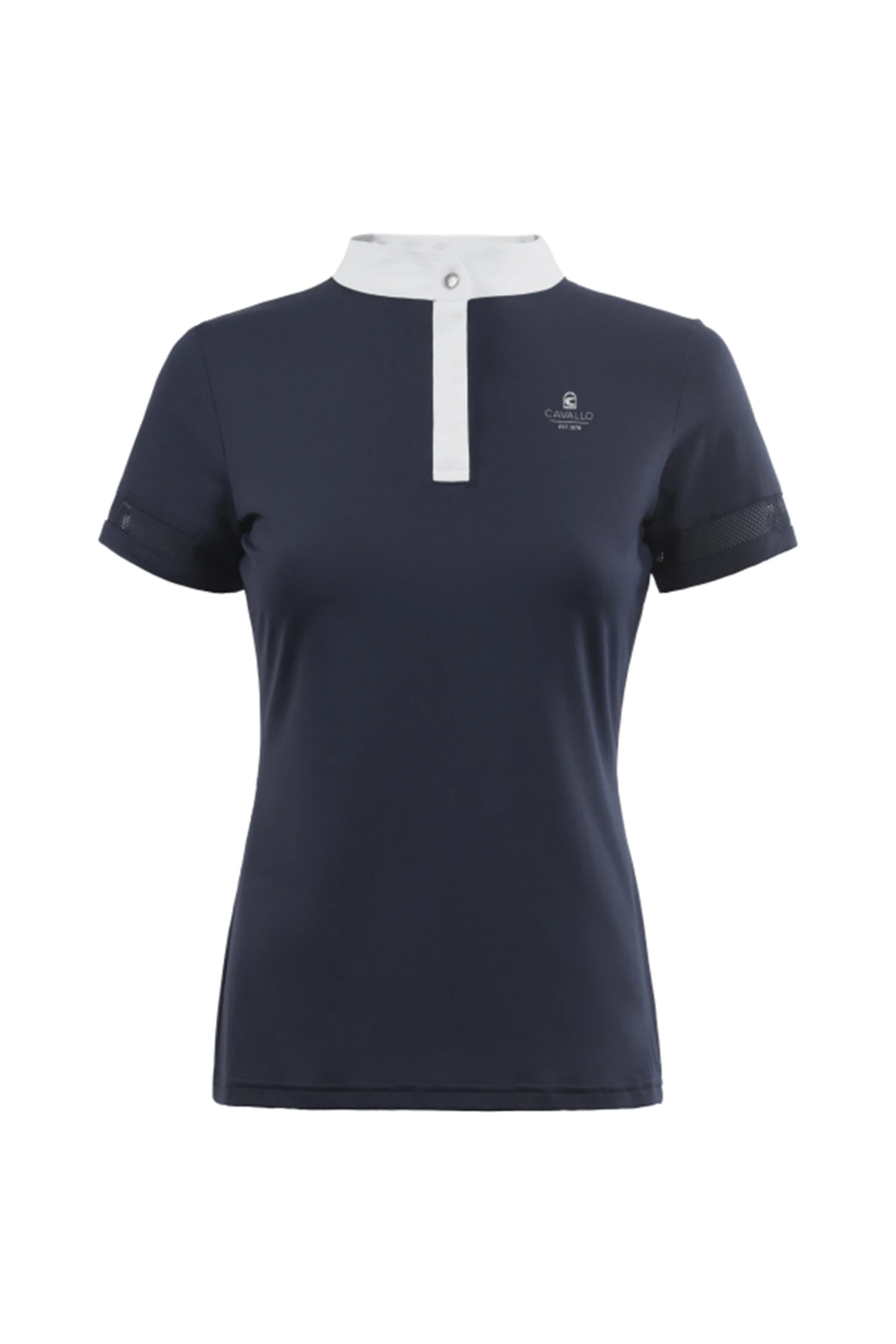 With stand-up collar made of functional jersey. Stand-up collar with concealed button placket with press studs and a decorative button. Mesh insert on sleeve hem and back yoke. Silver artwork on the left chest.