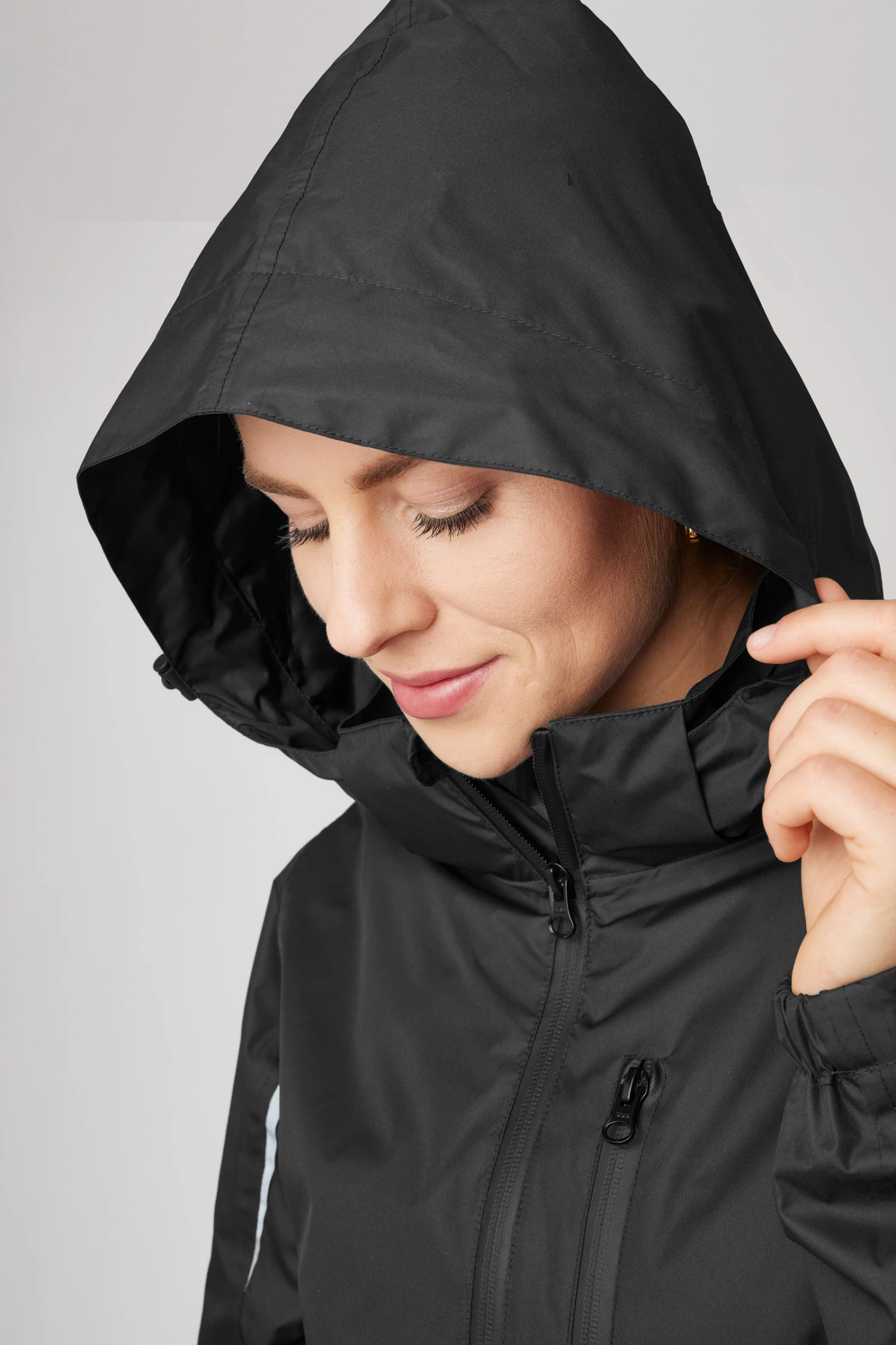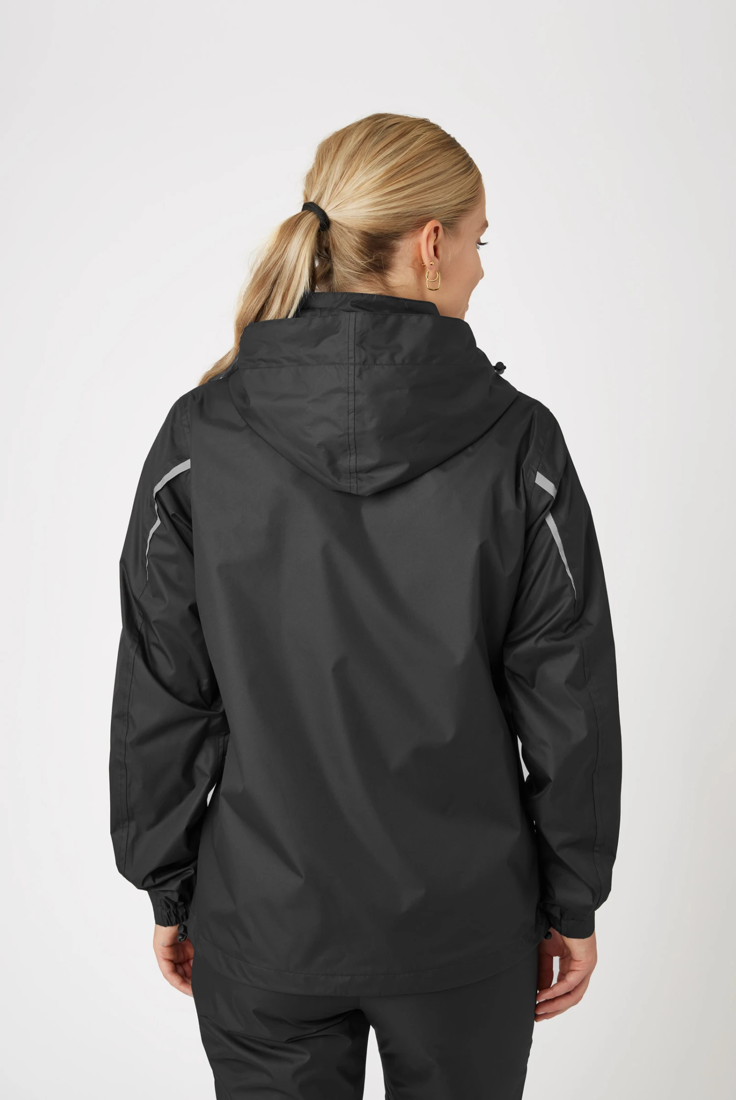 This classic rain jacket is part of a matching rain set and pairs perfectly with the #33698 Alexis Rain Pants. With a waterproof rating of 3000mm and breathability of 3000mvp, it keeps you protected from rain while allowing moisture to escape. The removable hood adds versatility, and the reflective printing on the arm and piping at the front and back enhance visibility in low-light conditions. Complete with a zipper chest pocket, this totally waterproof jacket is both functional and stylish.