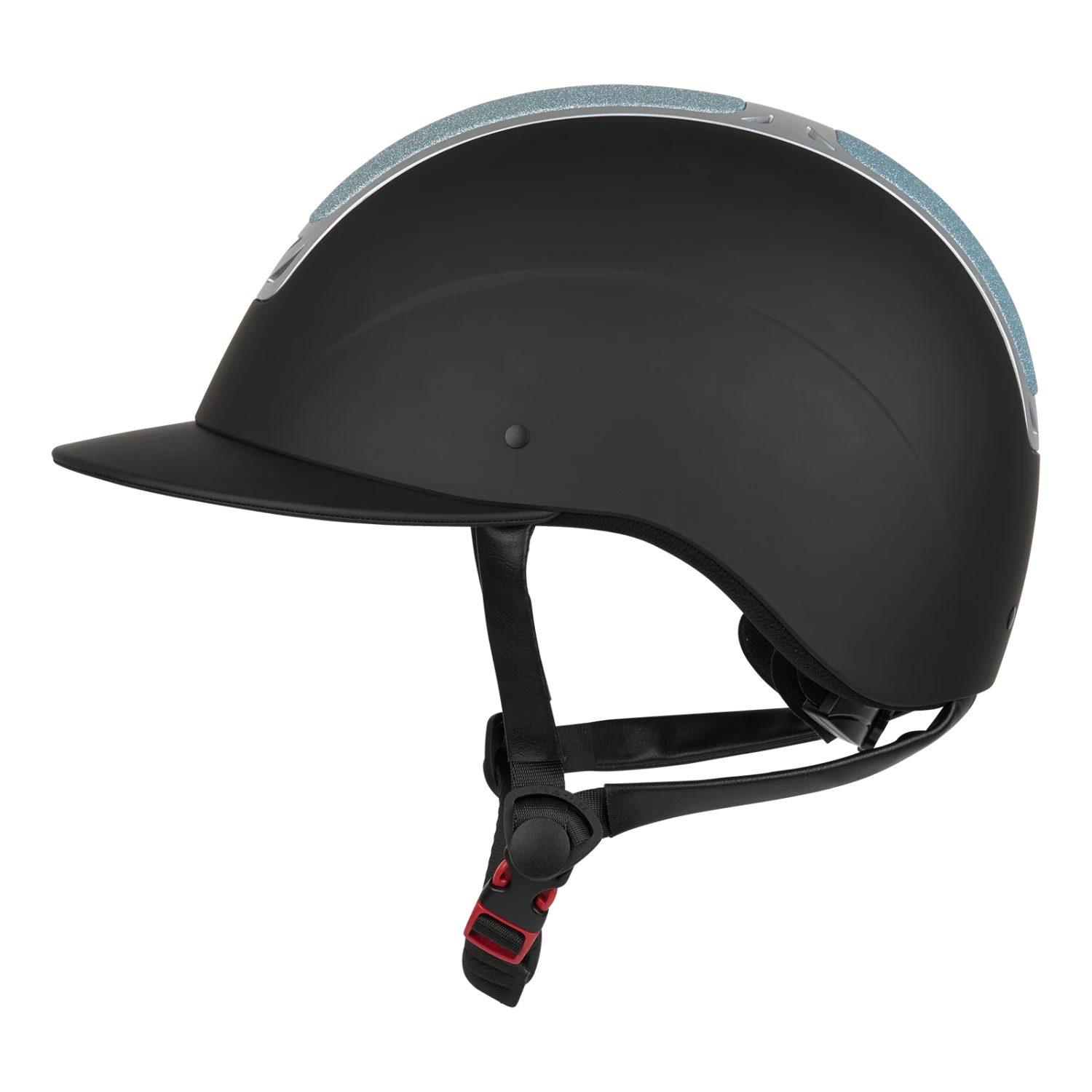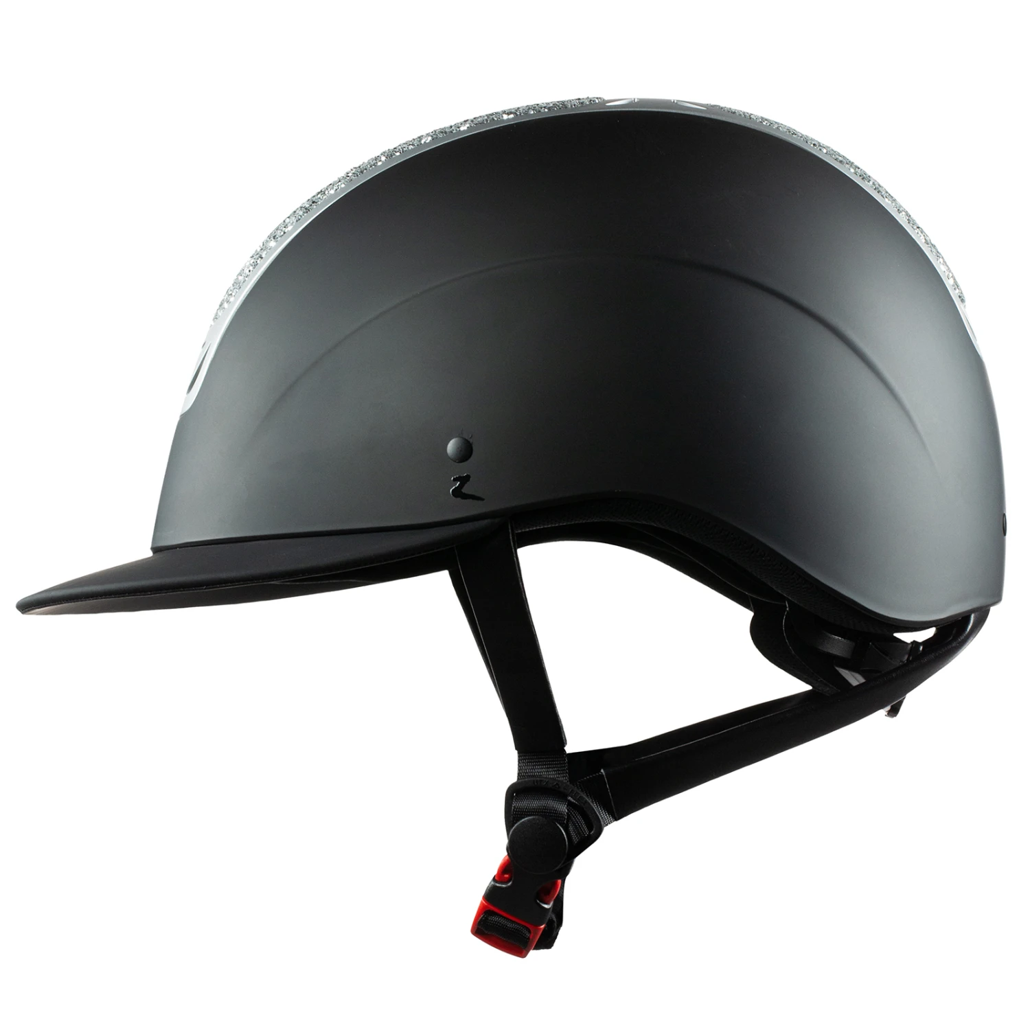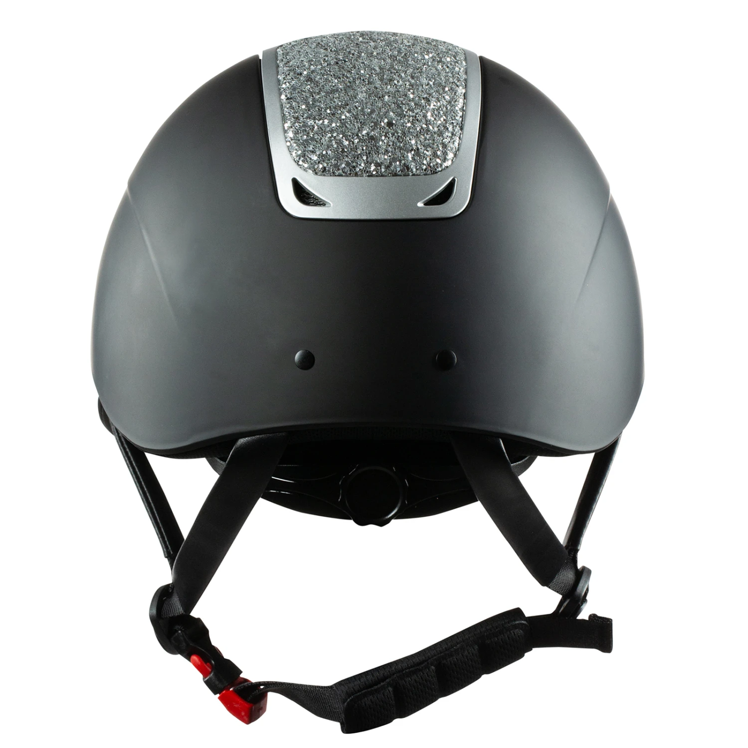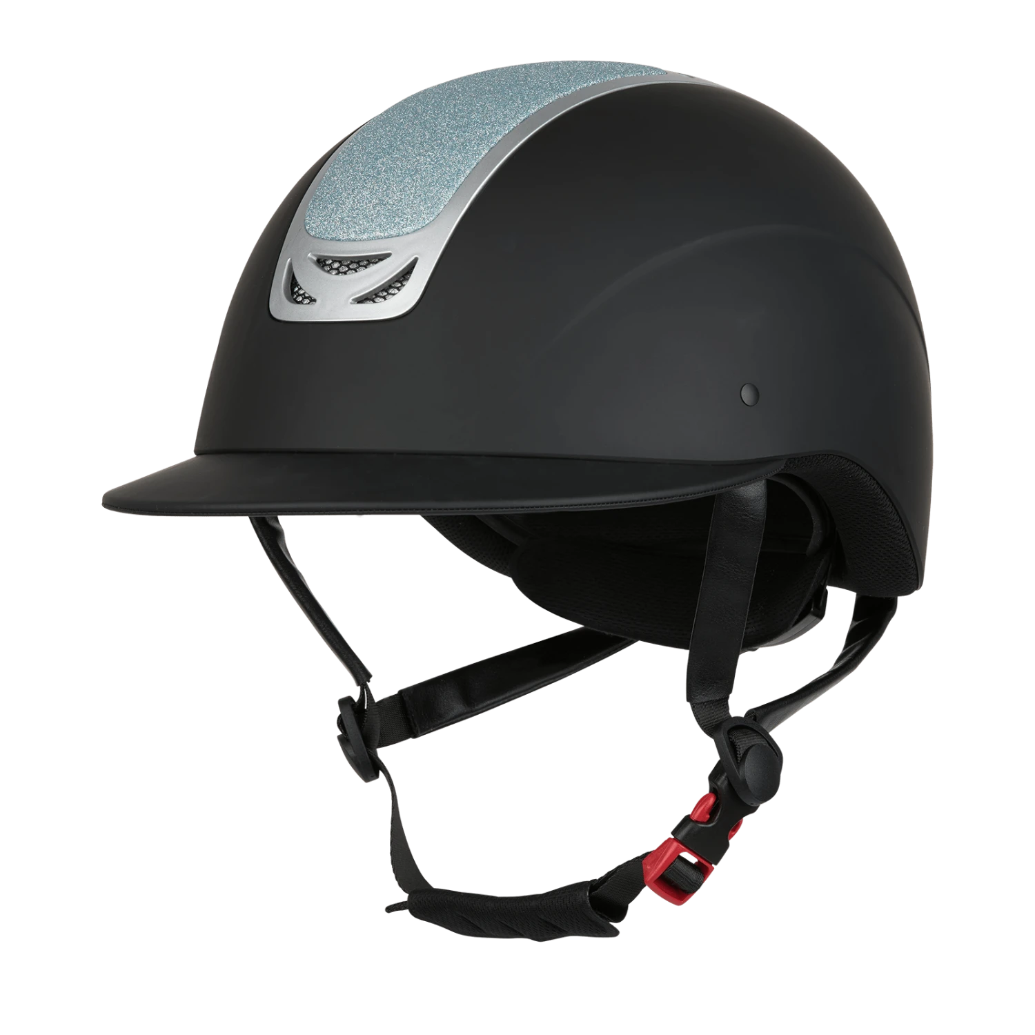 The Horze Arix Helmet can withstand high impact, and ventilation slots offer comfort with plenty of air flow to keep your head cool. The crystal panels with glitter on the outer shell of the helmet add a touch of elegance to your riding outfit and come in a variety of stylish colours. The wide visor provides extra cover. The dial system allows you to adjust it for a perfect fit. Memory foam lining cradles your head in comfort while offering protection in the event of a fall. A flexible peak brim adds more safety.