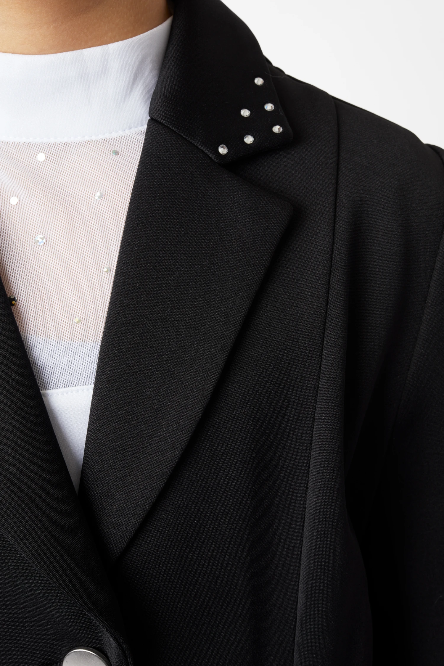 You child takes part in the first shows? Whether it be dressage or show jumping, this show jacket with its traditional cut and rhinestones on the collar will be the perfect choice for young girls who like a bit of sparkle. The jacket closes with button, has two flap pockets and slits at the back for increased freedom of movement while on horseback. Small ‘h’ metal charm on left pocket flap.