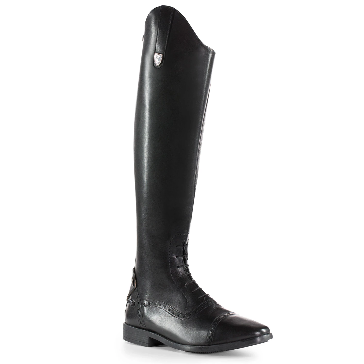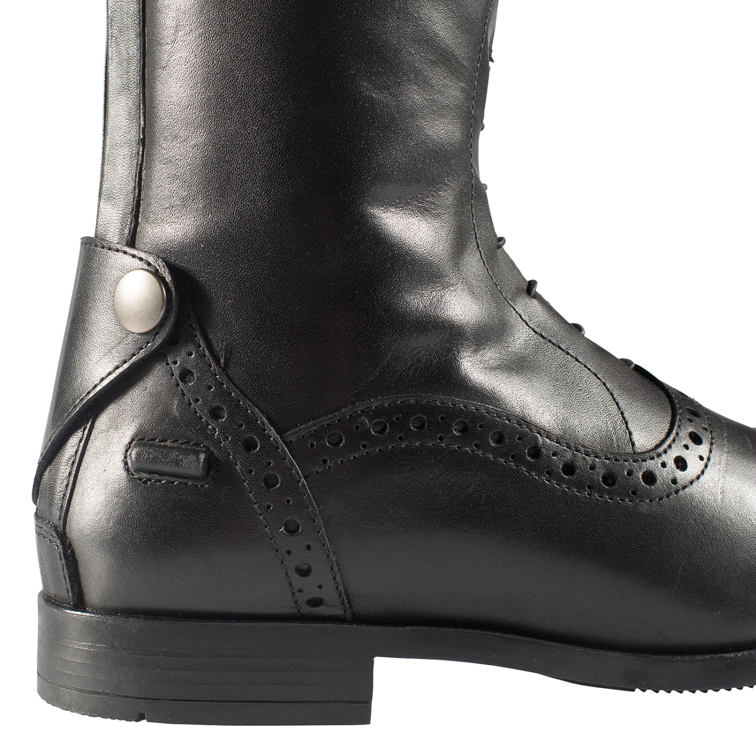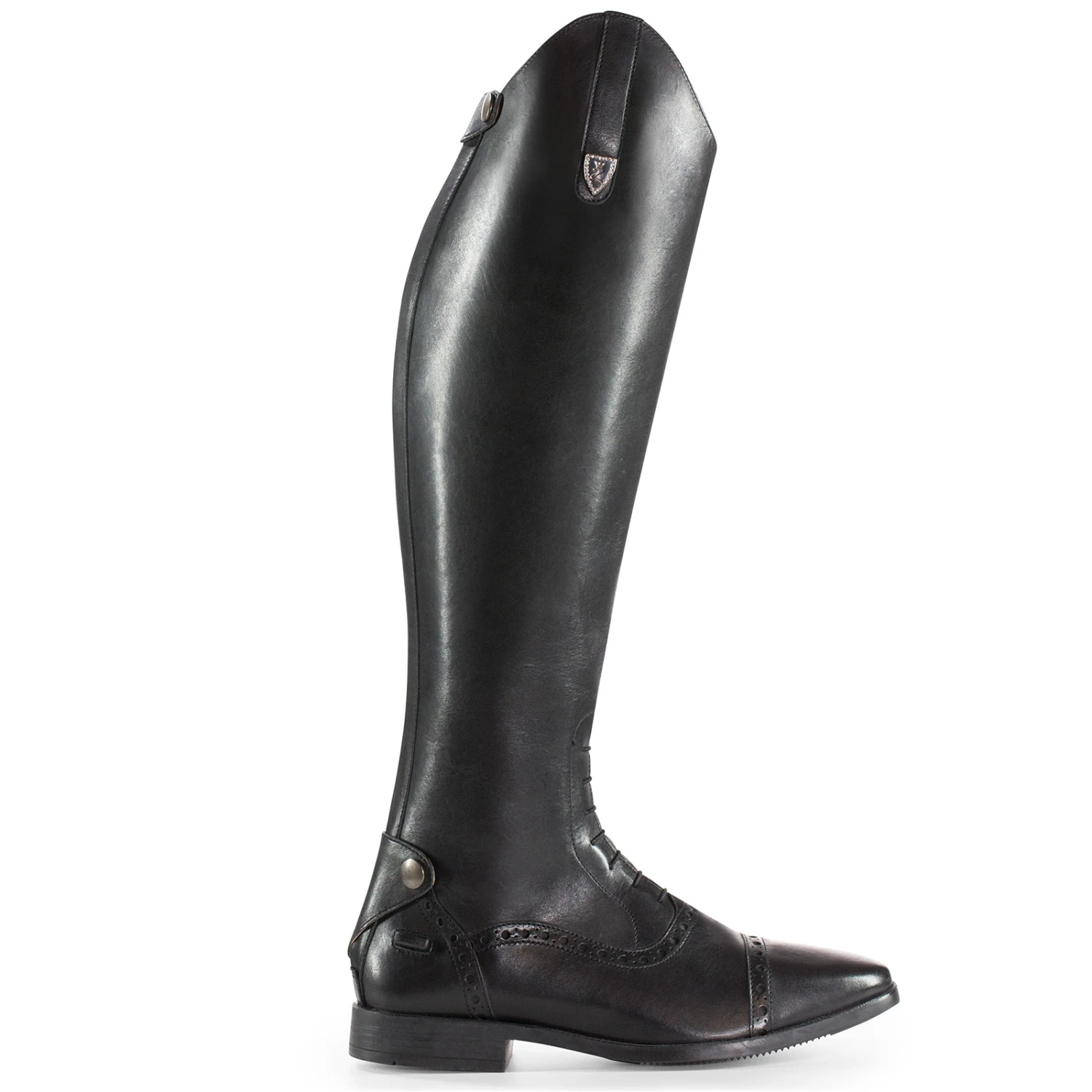 Tall field boots are a must for competition when half chaps and jodhpurs just won’t do. These beautiful Brazilian leather boots have a back zipper with an elastic flap to look sleek and smooth. A rubber sole and multiple foot sizes and widths offer comfort. The foot has punched details, fixed elastic laces and a nice spur rest. The lining is soft suede for comfort. Z emblem at the top of the leg shaft includes a small metal button with crystal-encrusted logo. A leather strap with snap button at the top and bottom of the zipper keeps this boot securely fastened.