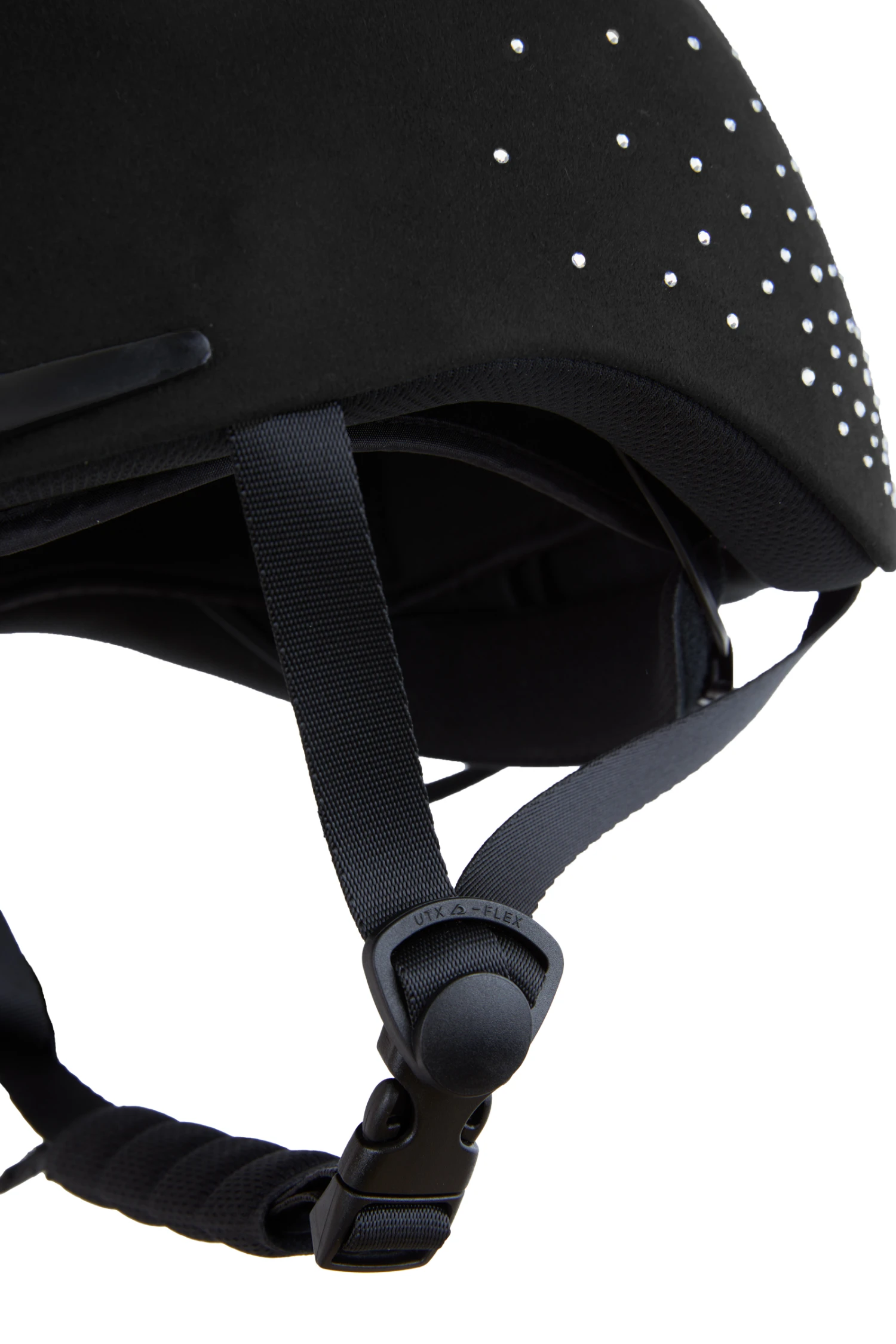 This new helmet is covered in soft velvet fabric, and decorated with lovely rhinestones that add a touch of glamour to your outfit. Breathable lining keeps you comfortable. The buckle closure is extra secure due to an additional hook-and-loop fastener. Adjust the helmet for your perfect size.