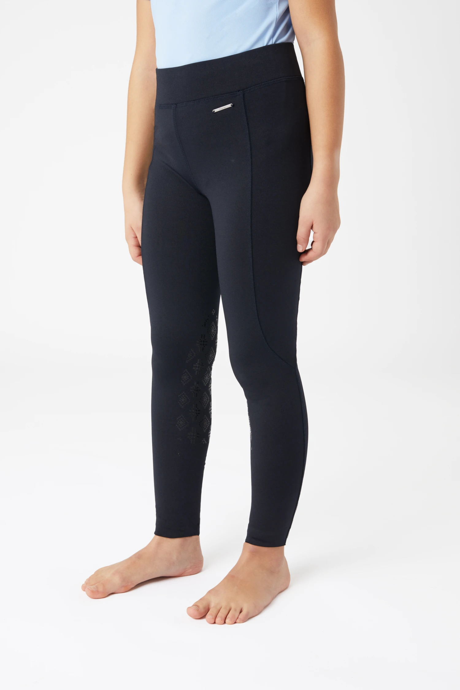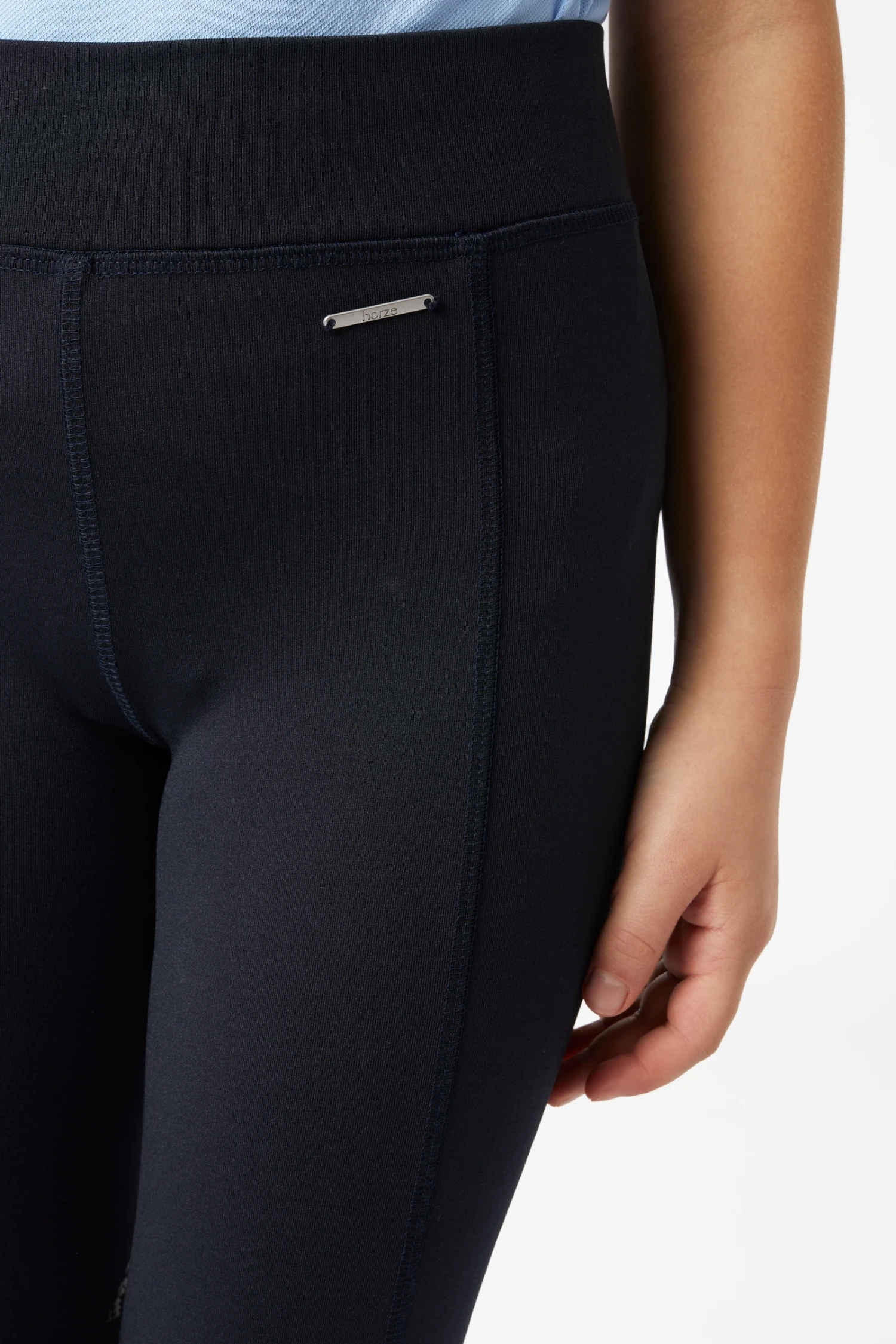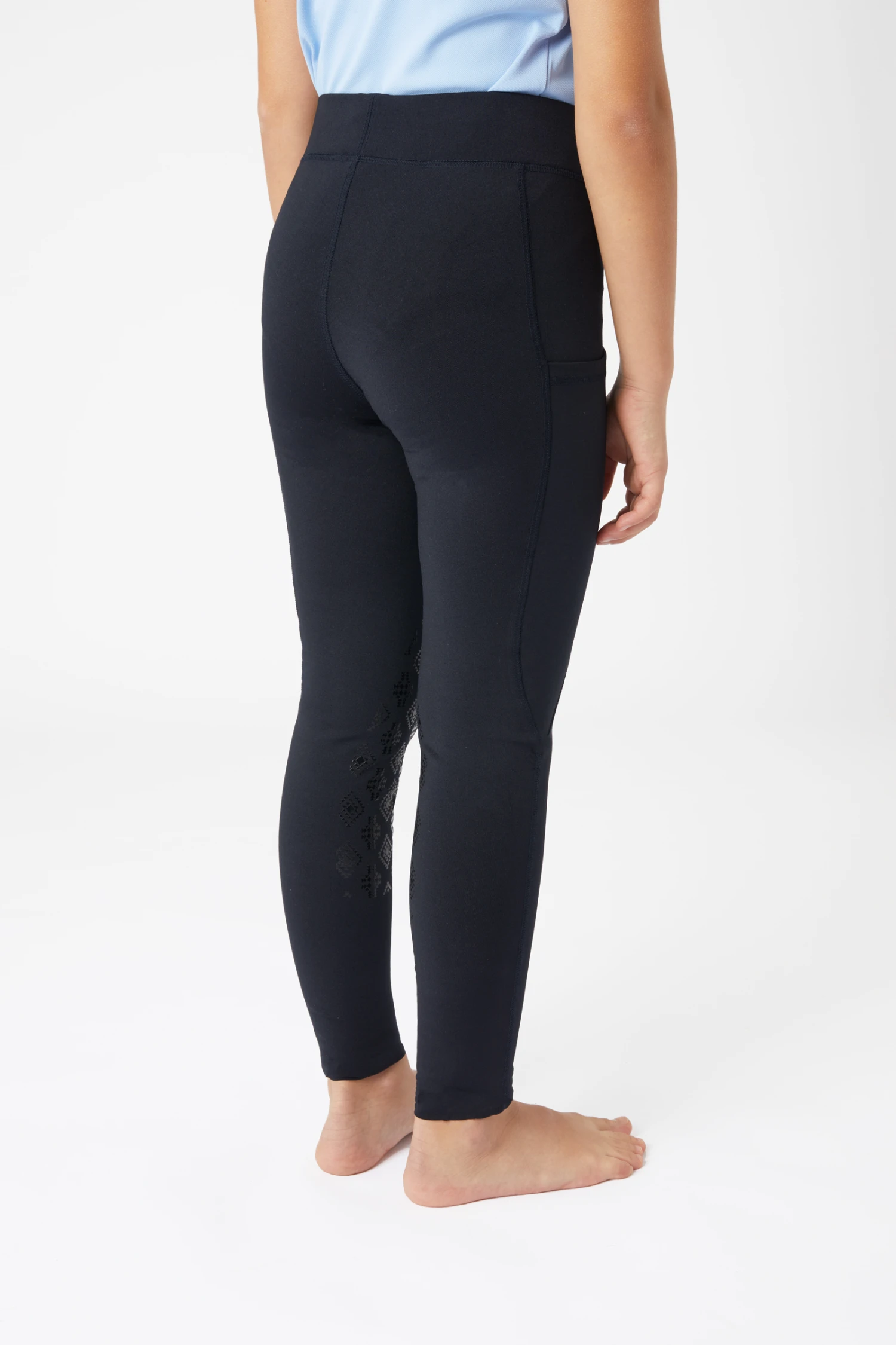 A classic pair of kids’ riding tights made of soft stretchable fabric for wearing comfort. The knee grip features a delicate Aztec print pattern. On the left thigh a large pocket offers room for your kid’s phone. A small logo metal charm can be found on the left front below the waistband.