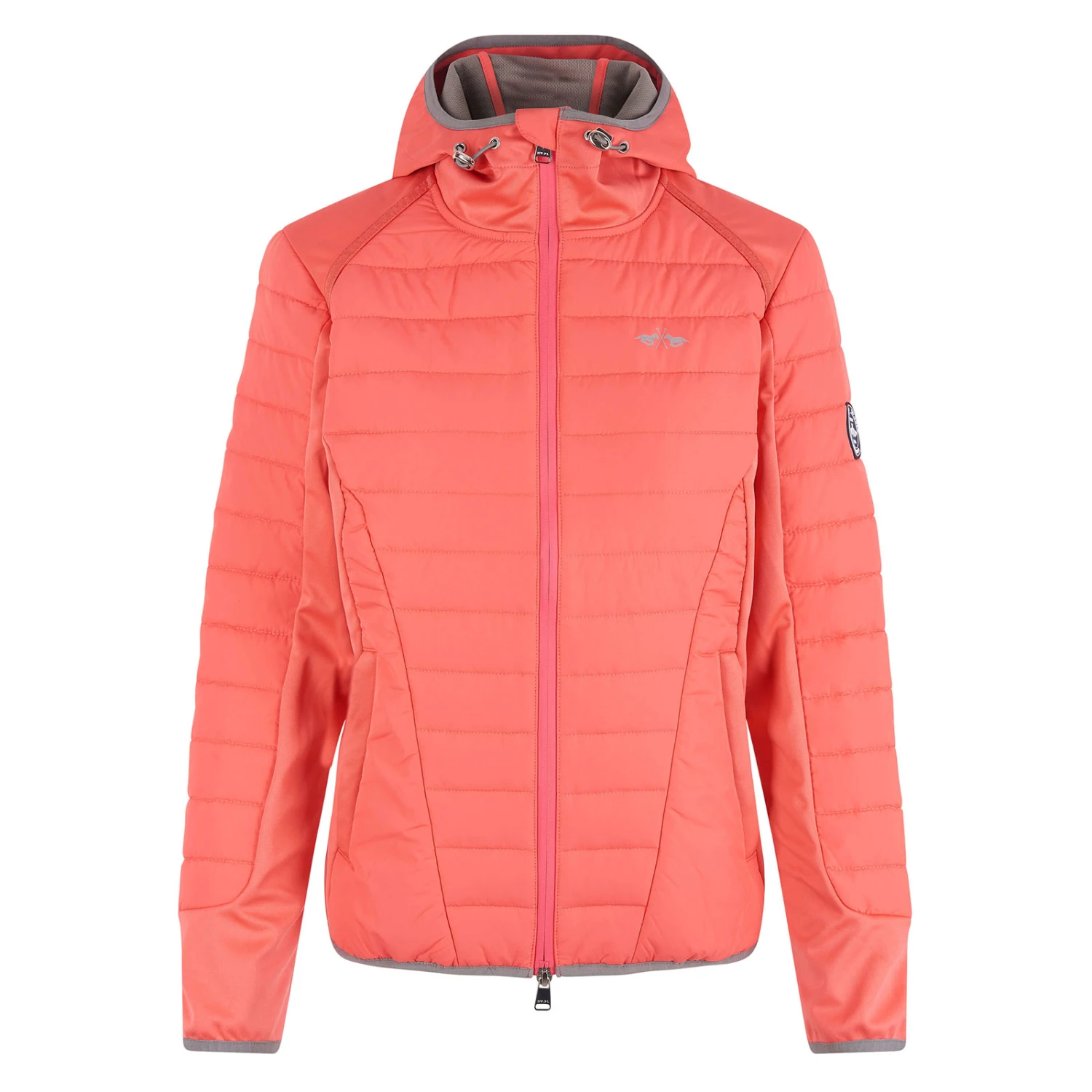 This sporty hooded jacket features contrast coloured binding. Part of the body and sleeves are filled with down and the other parts of the sleeves and side panels are made of softshell fabric. This stylish and practical jacket features several pockets and a silicone badge on the sleeve.
