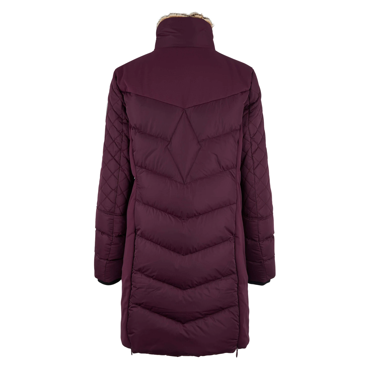 Water resistant quilted heavy padded parka jacket, with padded softshell side insert and windcatcher cuff for a sporty fit. Fake fur lined collar and fleece lining at upper body for extra warmth. Mirror look zipper 2-way front zipper and side slit zippers for fitting jacket over saddle, 4 hand pockets and inside pocket.