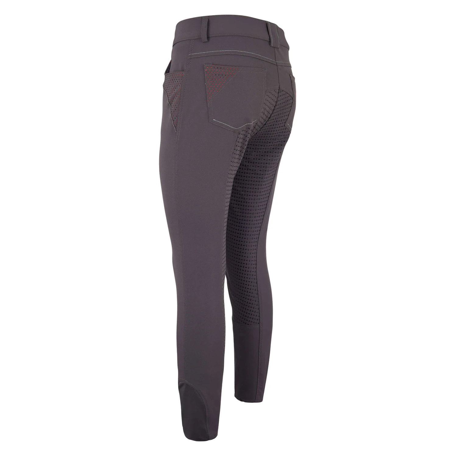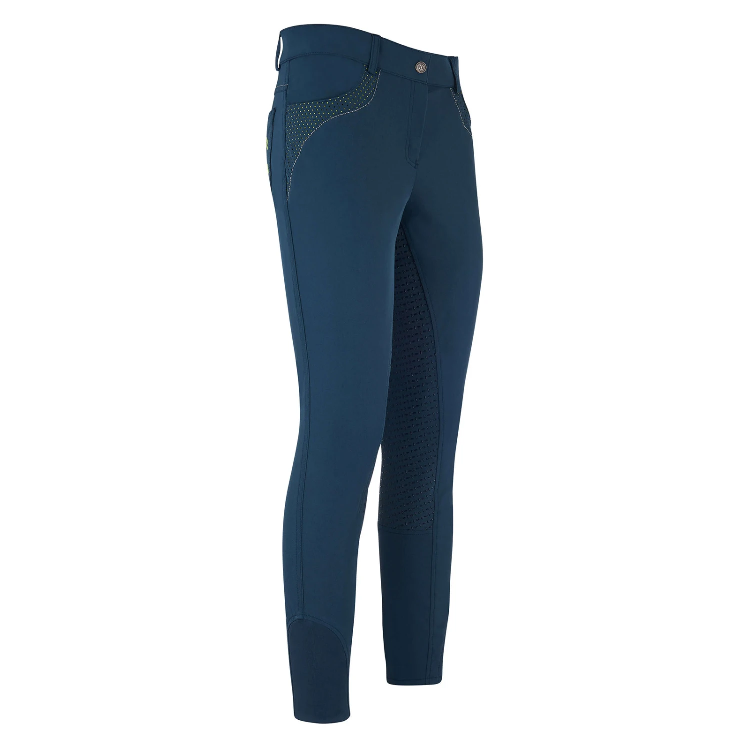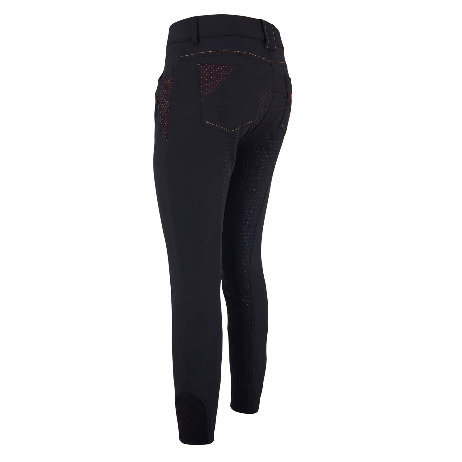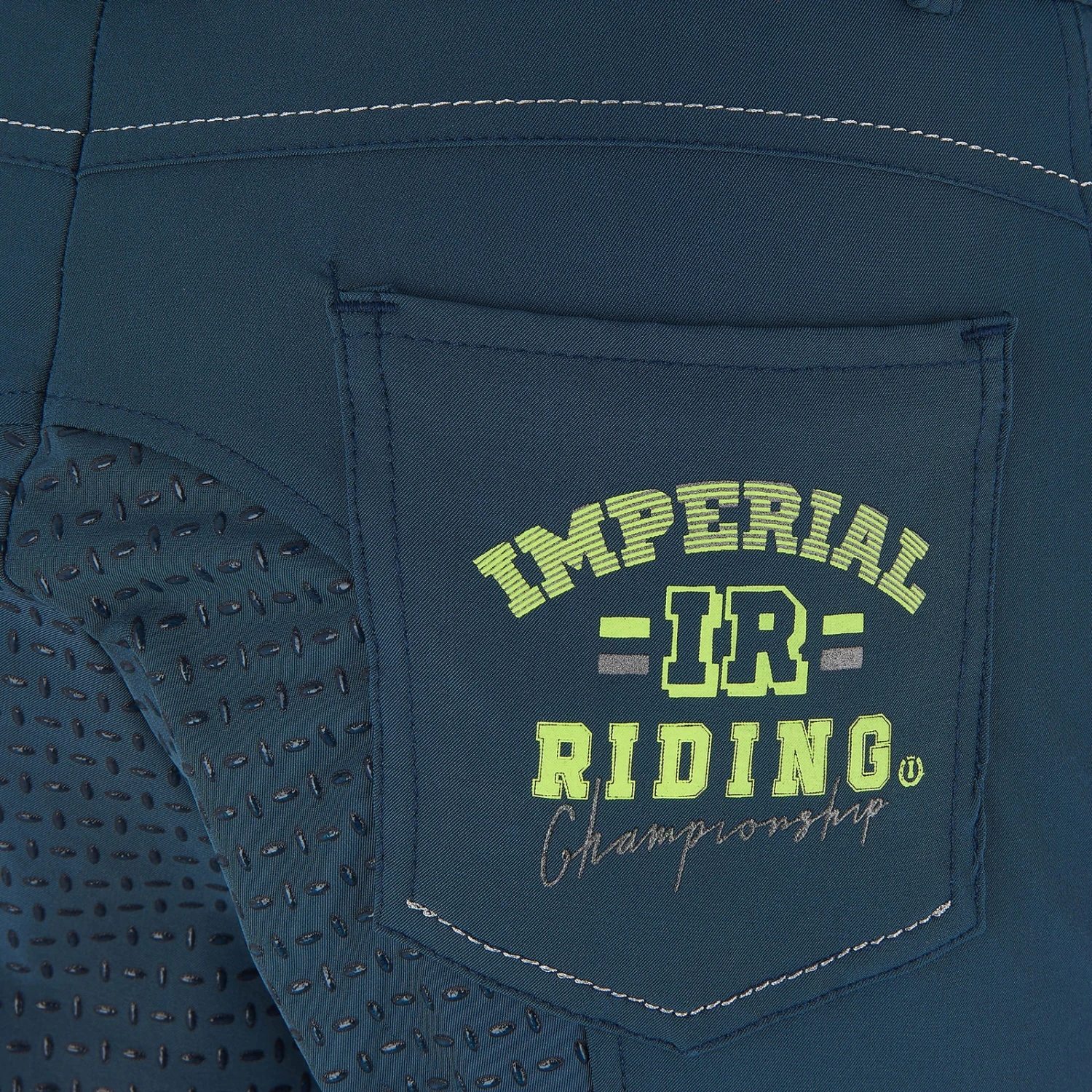 Classic cut with medium-high waistband and full seat. Beautiful breeches with four pockets. Swing pockets are the front with curved access and perforated contrast holes, and a curved decorative seam. Sewn-on rear pockets with hole pattern and contrast embellishment, and curved decorative seam. A glitter strap runs horizontally across the pass, between the rear of the waistband and the pockets on the rear. The waistband features a button with engraved Imperial Riding logo with horseshoe and crown.Elastic leg gathers ensure pleasant wearing comfort. The fabric used consists of a particularly low-maintenance and comfortable 4-way stretch. Let’s ride!