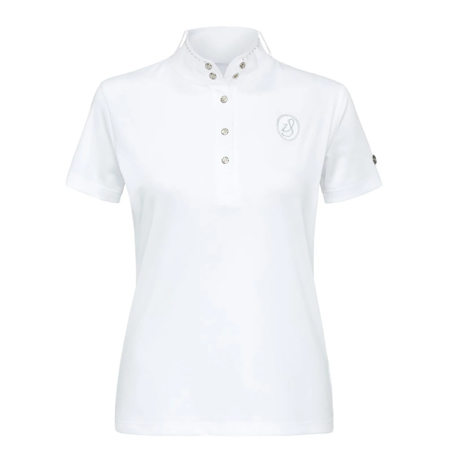 Modisches Damen Turniershirt mit Steinen am Kragen und Bruststickerei. Mit kurzen Ärmeln.