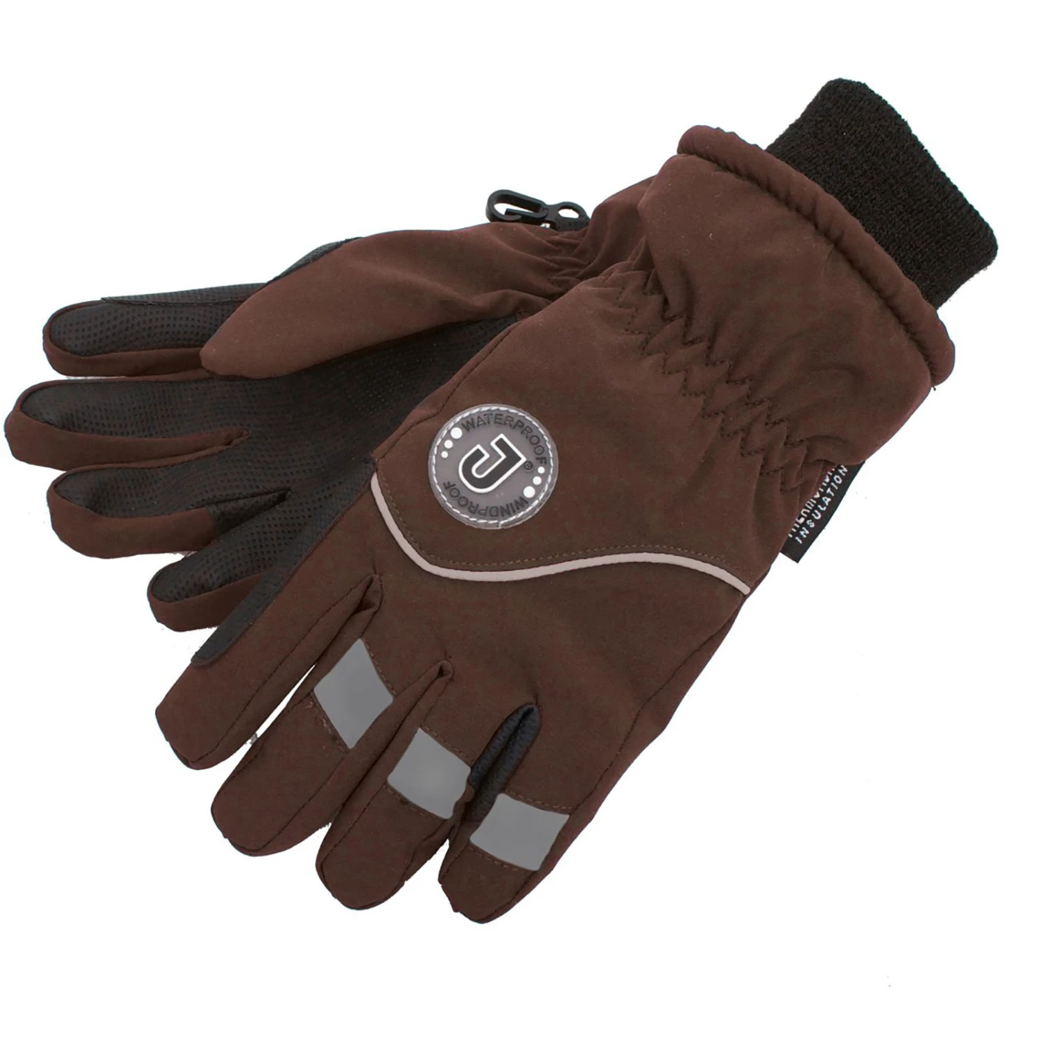 Thermo gloves with reflective details and reflective badge. Warmly-lined with thermo fibre. Knitted cuff at wrist. Reinforcement for the reins.
