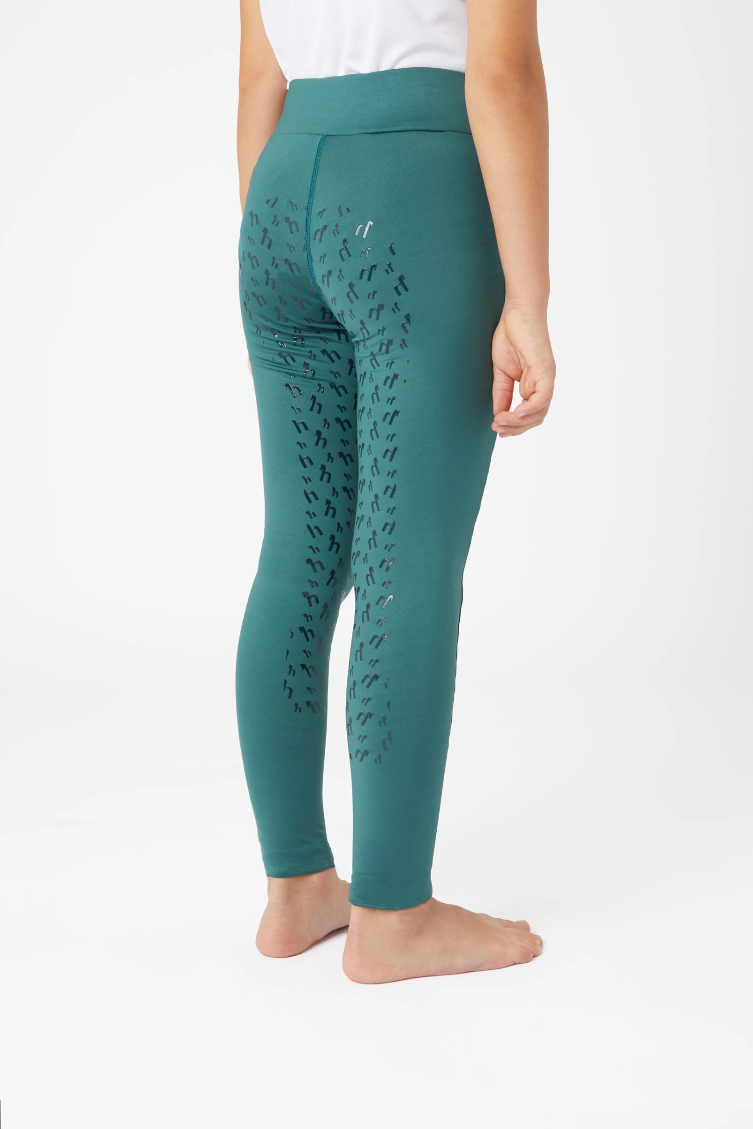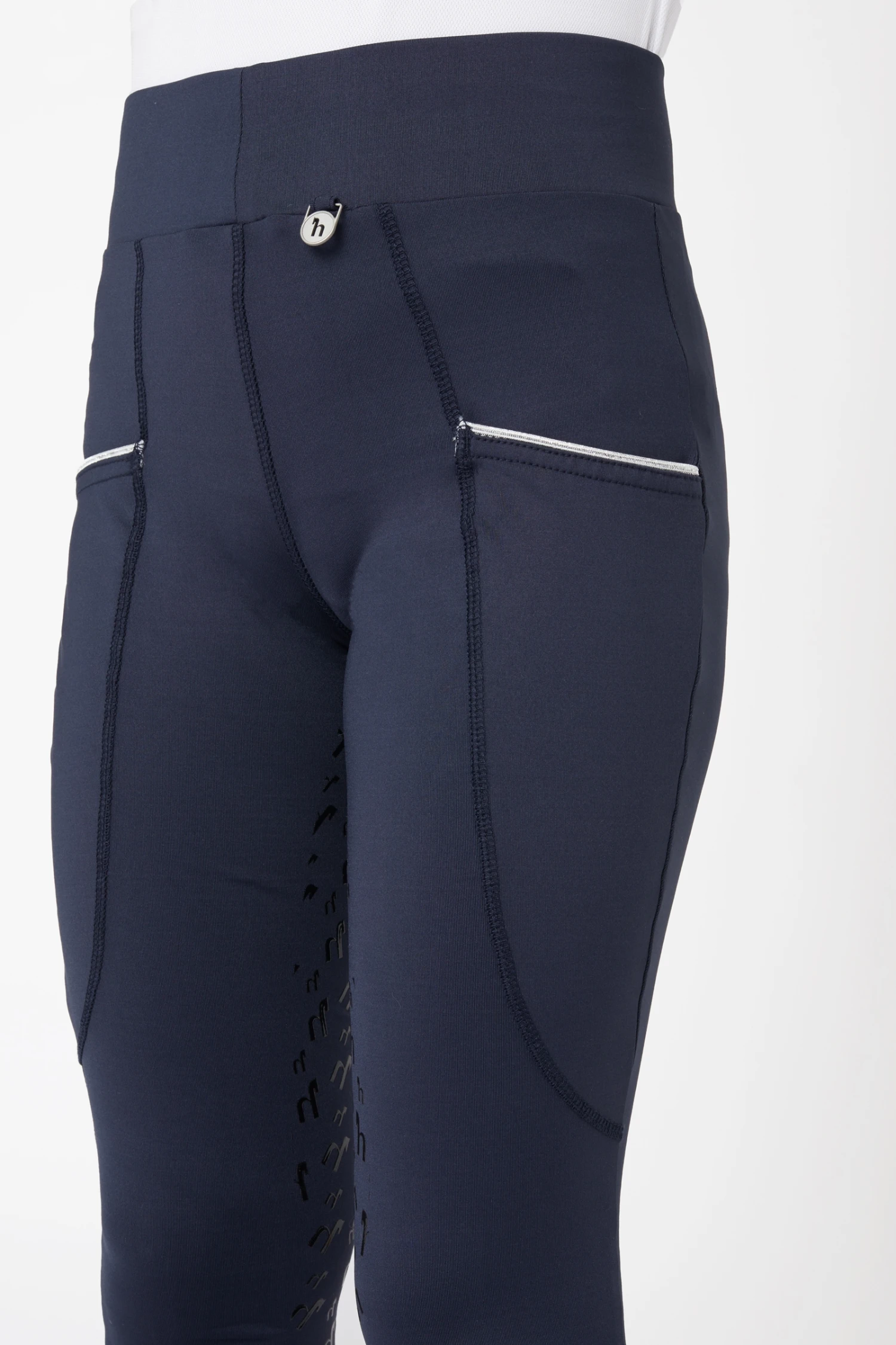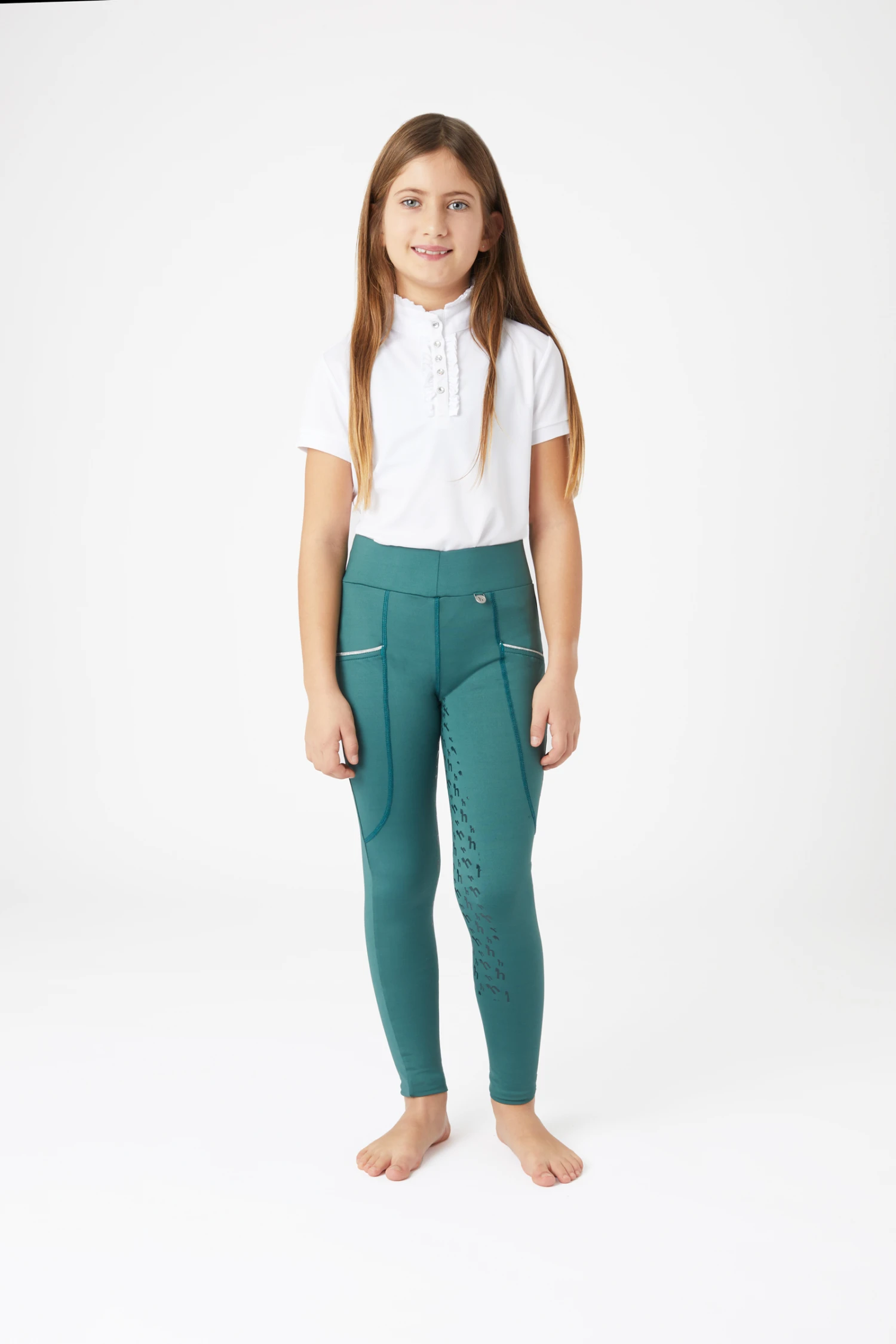 Sporty kids’ tights with chic glitter piping along the mobile phone pockets on both thighs. No annoying seams along the knees for more comfort in the saddle. The silicone full seat supports your seat in the saddle. The comfy and stretchy material is perfect all year round and gives you freedom of movement also while being outside of the saddle.