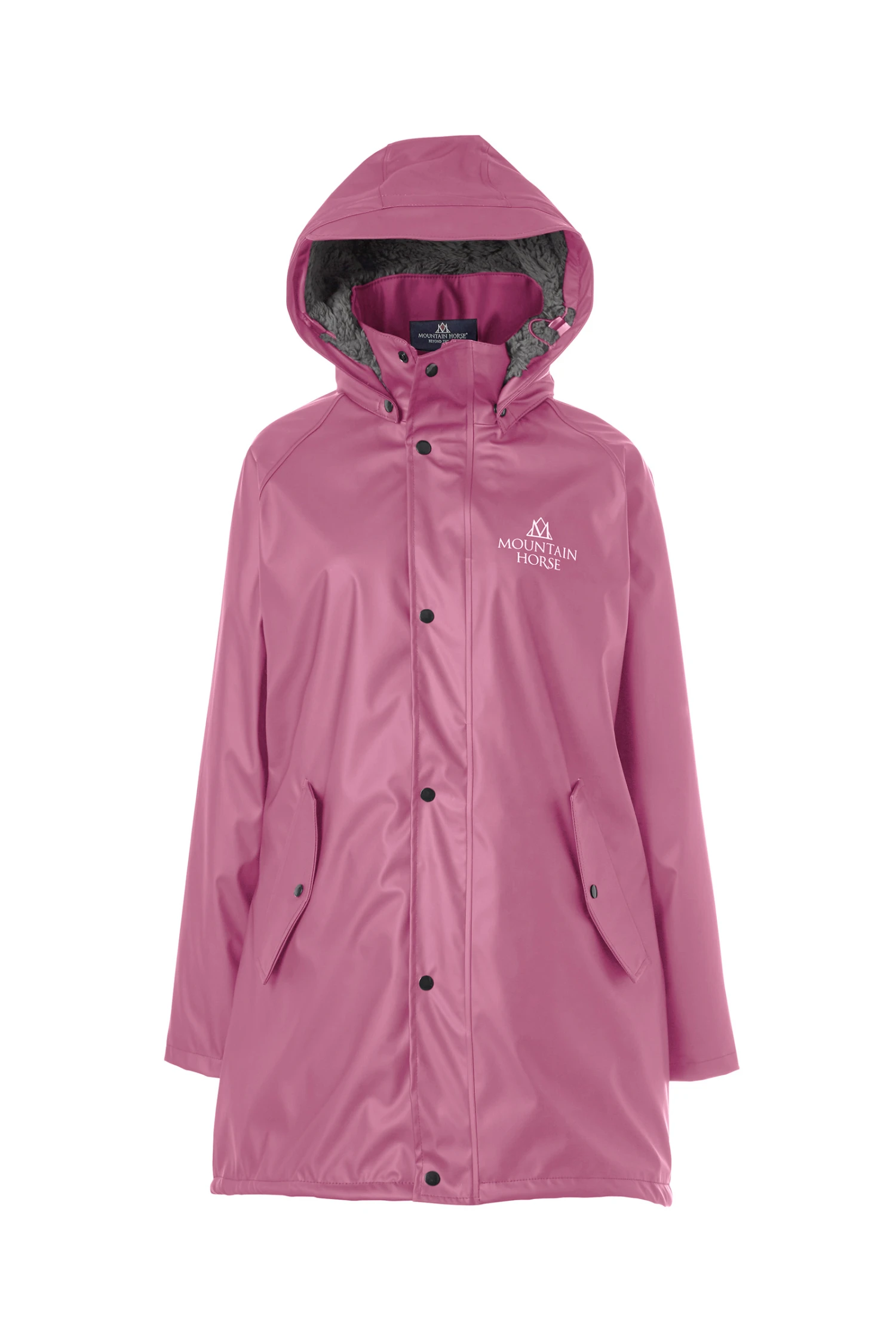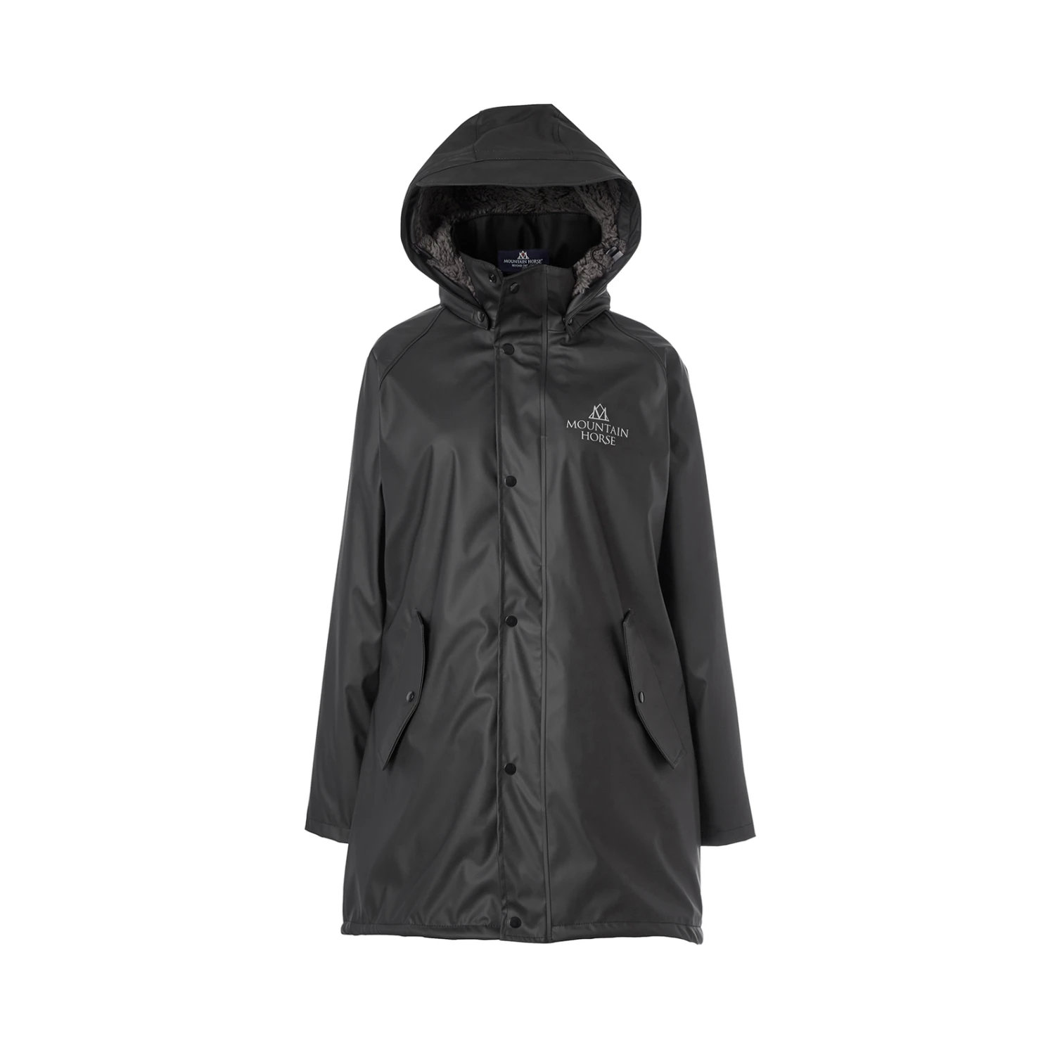 This fully waterproof rain coat with welded seams will keep you dry even in the heaviest rain. Lined with cosy soft pile fabric it is comfortable to wear. The large front pockets are perfect for stowing away horse treats or your phone. The riding slit at the back combined with the two-way zipper makes the coat perfect for riding. Reflective details provide enough visibility in the dark.