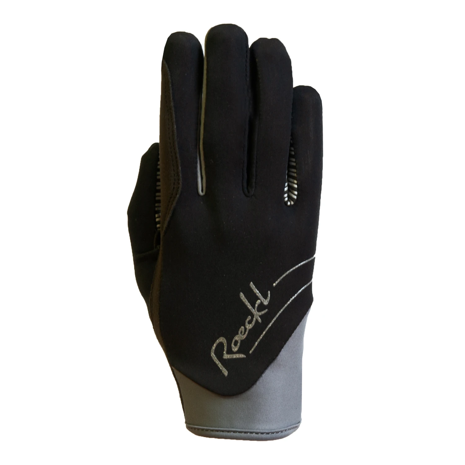 The JUNE is a real eyecatcher – a sporty, elegant and highly comfortable riding glove for fashion-conscious female equestrians. The JUNE is available in the color combinations black/grey and black/berry as well as navy blue; it is highlighted by a feminine, discreet and sparkling ROECKL lettering. Apart from its appealing look, the JUNE has also got lots of features to offer: Supple, elastic Lycra on the backhand provides high wear comfort and playful mobility for your fingers. Lycra absorbs sweat, dries quickly and is also napped and fluffy on the inside – for pleasant wear comfort, added warmth and first-class climate management. The palm consists of DURASENSE, a thin, tactile and a robust synthetic suede material that is laminated with a warming lining; thanks to non-slip ALL-WEATHER-GRIP siliconization, you will have optimum grip in both wet and dry weather conditions. In addition, the JUNE boasts a particularly comfortable and exact fit which is adapted specifically to the anatomy of the female hand, as well as ROECKL’s exclusive COMFORT-CUT: An easy closure fastener reliably secures the glove around your wrist. Convenient: The glove is machine-washable at 30° Celsius.